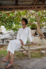 Our Signature V-neck Kaftan. This dress has a tapered cocoon cut and a flattering v-neck. Comes in one length. Hem sits above the ankle.